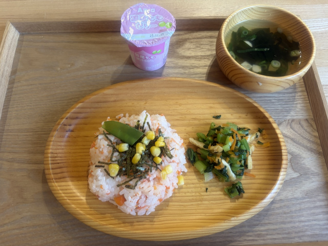 かつお菜のおかか和え:家では食べてもらえない食材の組み合わせでしたが、かつお節の香りとほんのり甘みがあり、食べやすかったです。