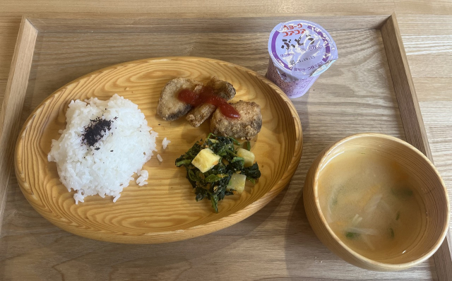 2025.10.02今日の献立ごはん ゆかり あじフライ ほうれんそうとさつま芋ごま和え 玉ねぎみそ汁 ぶどうヨーグルト
