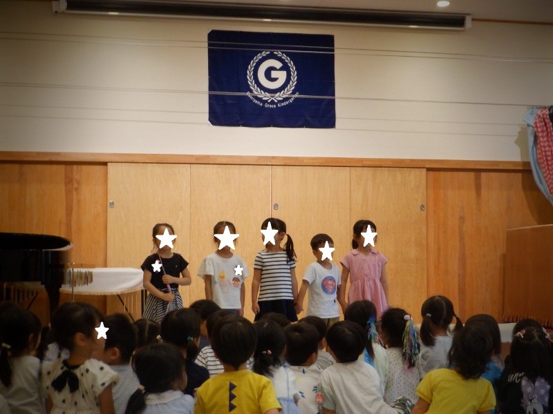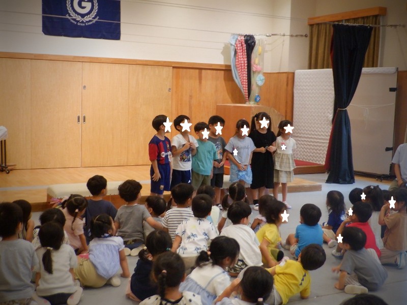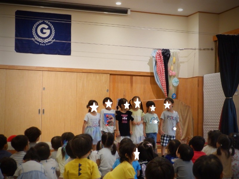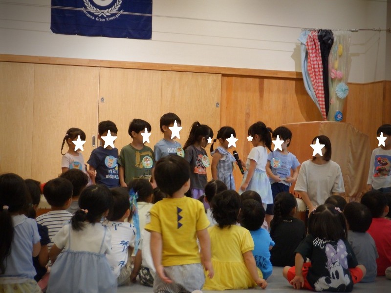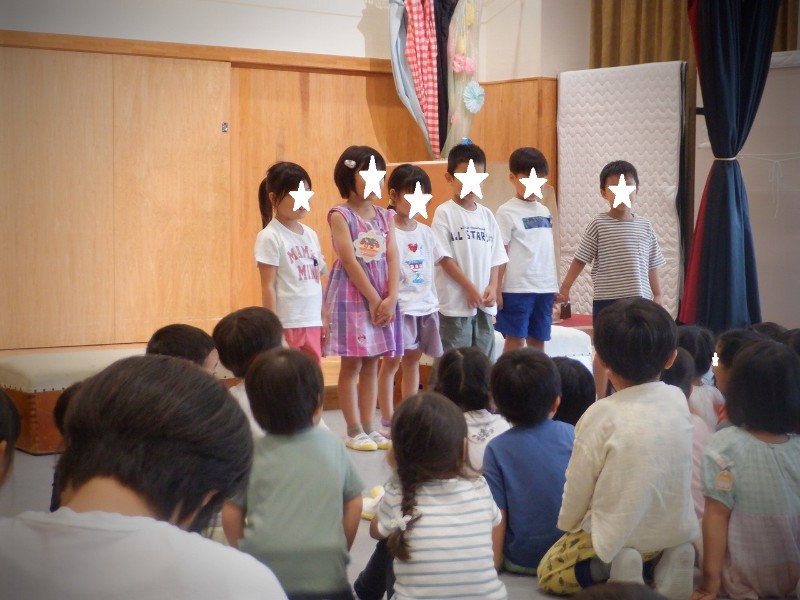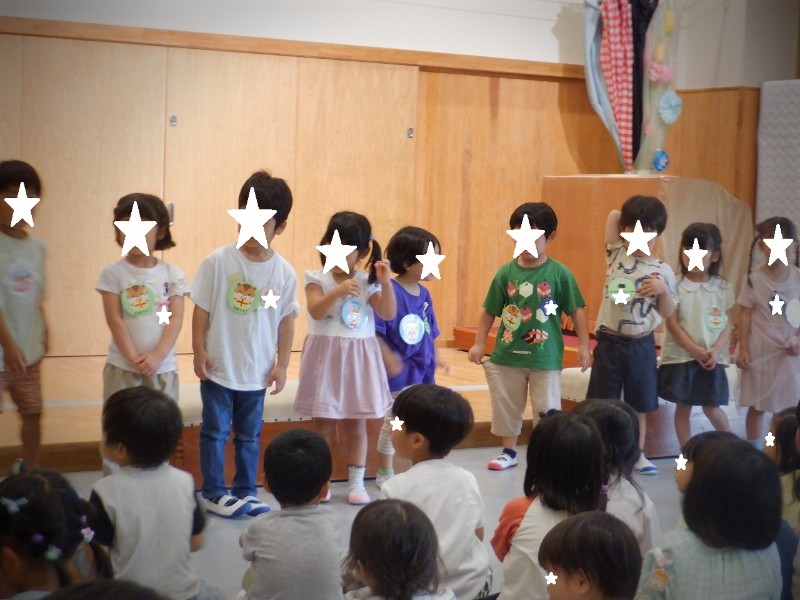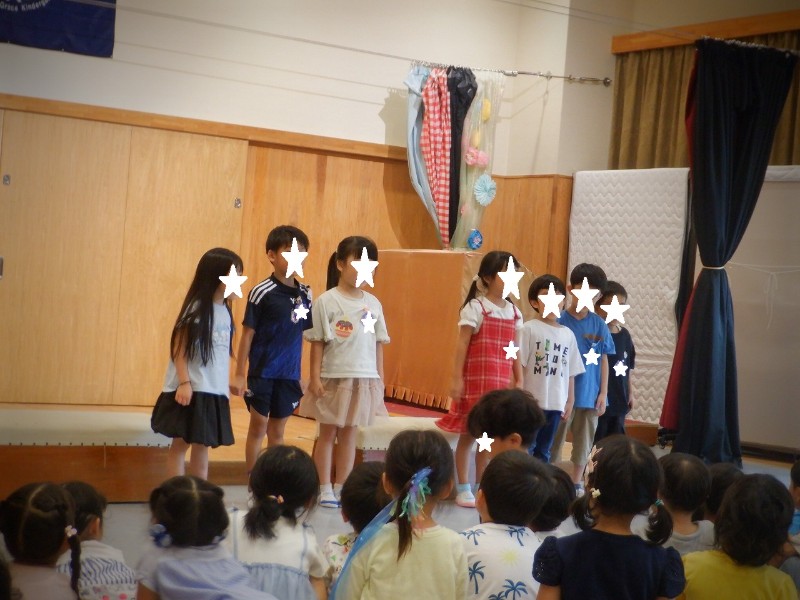 年中・年少組のために、9月生まれのお友達のために、とクラスのみんなで相談して言葉を考え、練習し、進めてくれました。年中・年少児はかっこいいお兄ちゃん・お姉ちゃんの姿を真剣に見ていましたよ。
