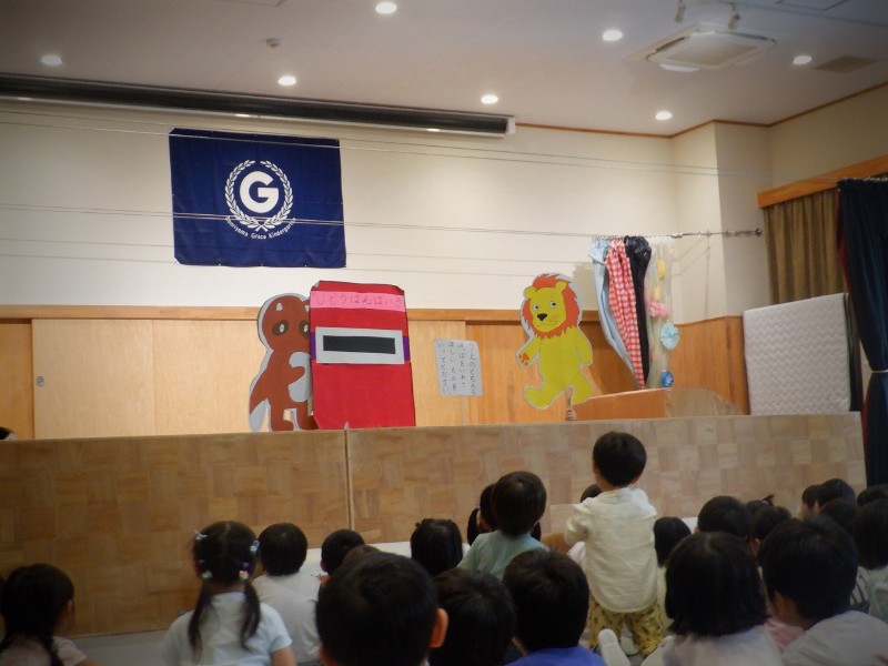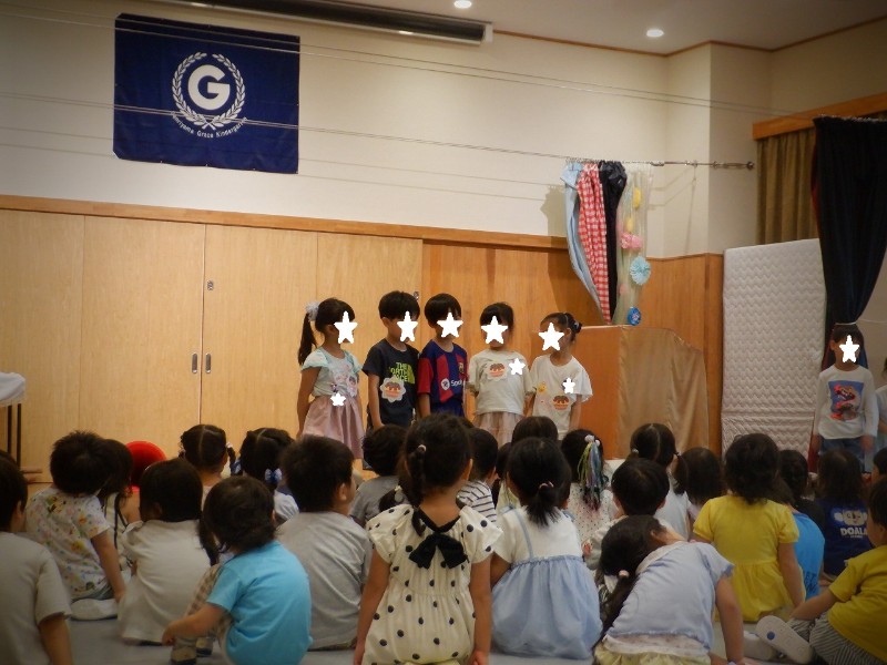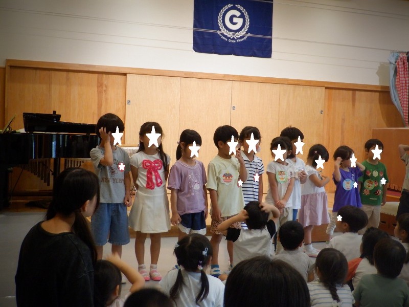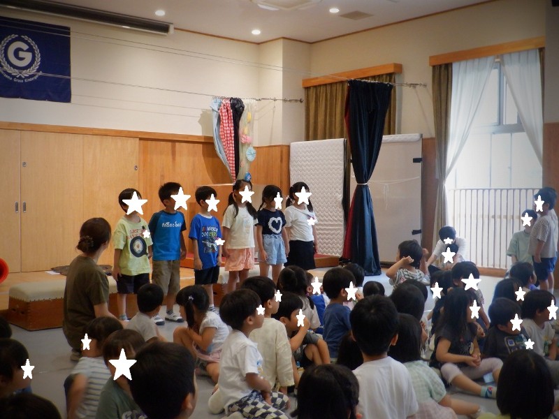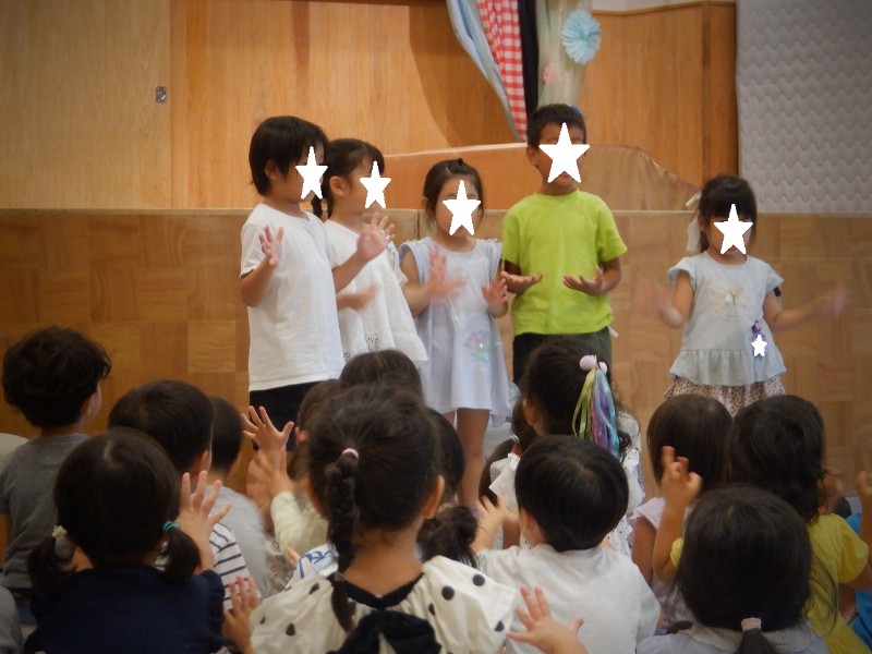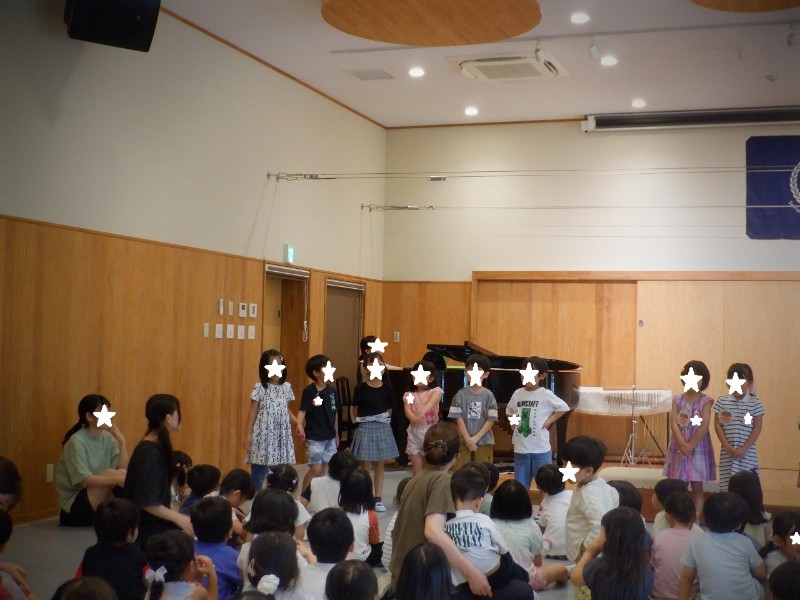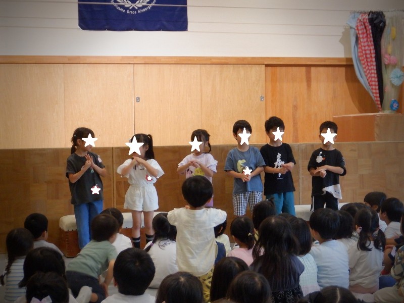 年中・年少組のために、9月生まれのお友達のために、とクラスのみんなで相談して言葉を考え、練習し、進めてくれました。年中・年少児はかっこいいお兄ちゃん・お姉ちゃんの姿を真剣に見ていましたよ。