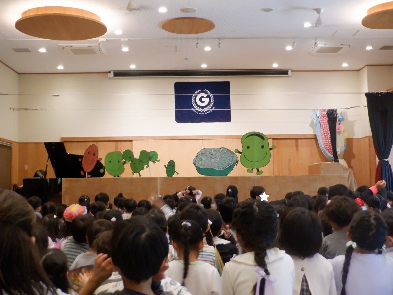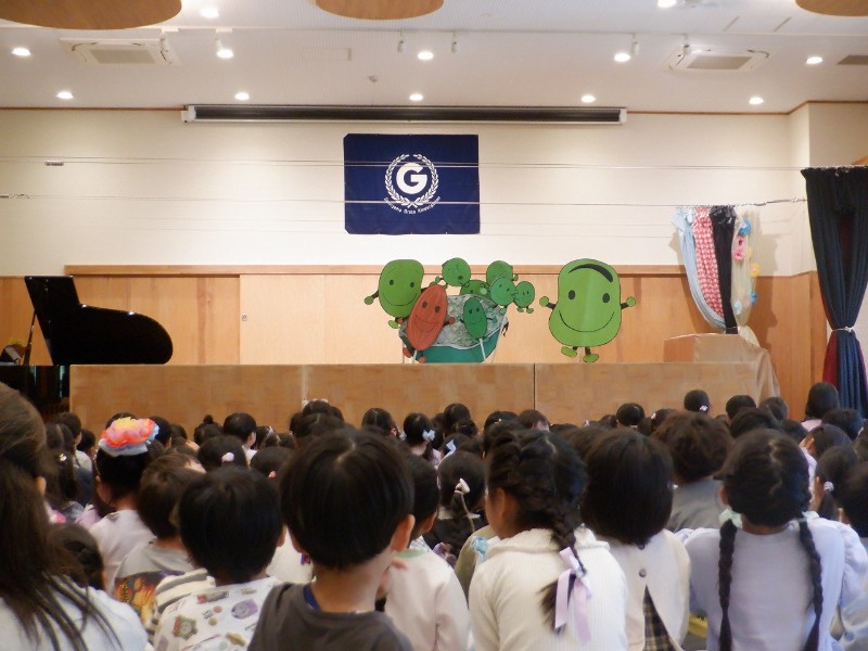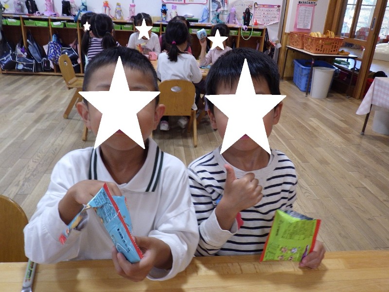 先生達からのプレゼントは、ペープサート「そらまめくんのベッド」で、おやつは「芋けんぴ」でした。甘くて美味しかったね♪