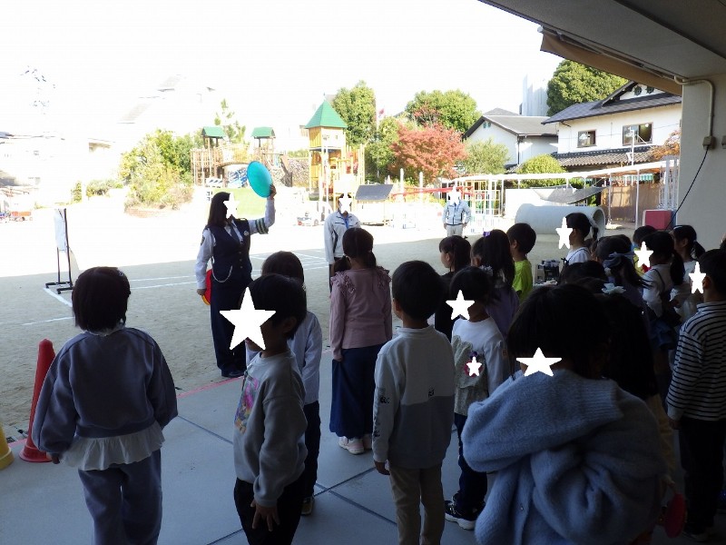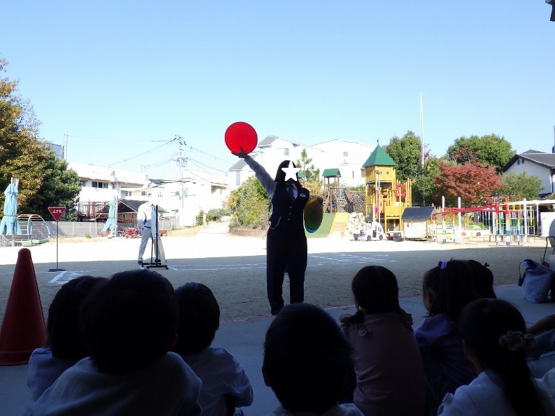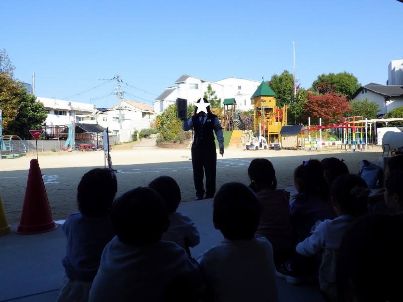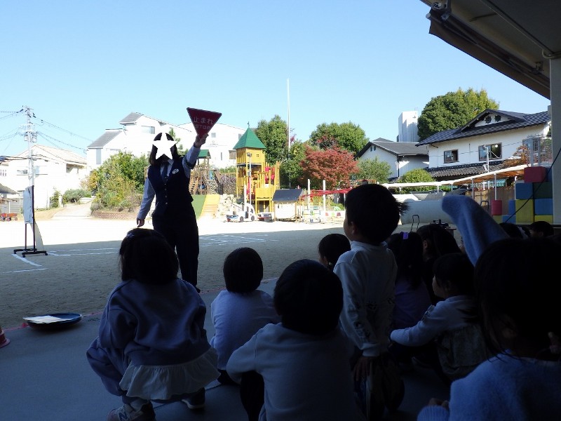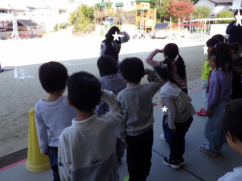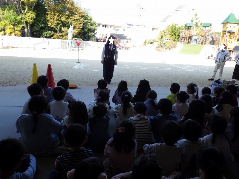 今日は年長組が、おまわりさんから交通ルールを教えてもらいました。