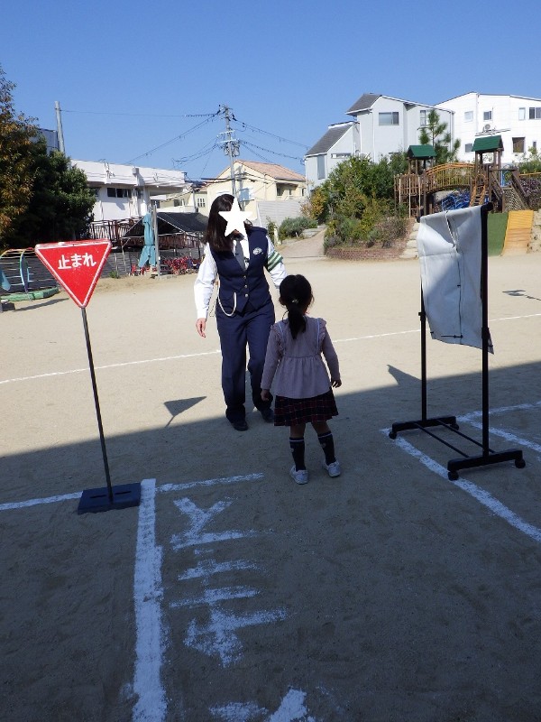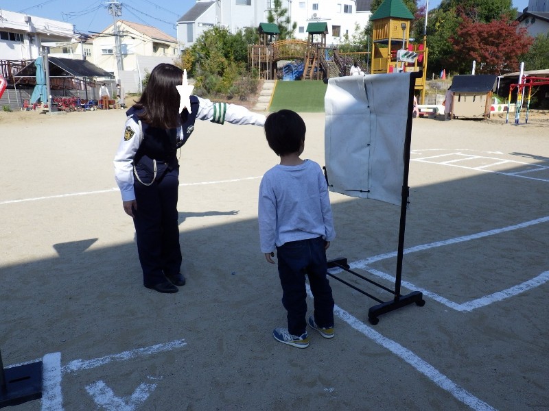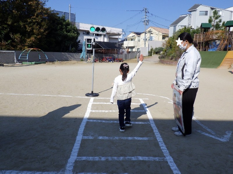 年長組さんは春から自分で歩いて小学校へ行きます。その時に安全に歩いていけるように、と信号の渡り方、曲がり角で気をつけることなど教えてもらい、白線で描いた道を実際に歩いてみました。