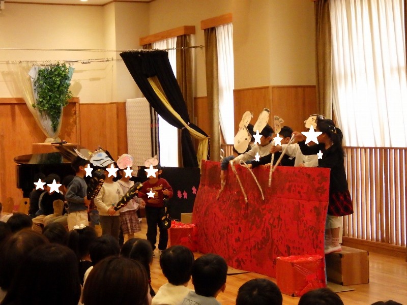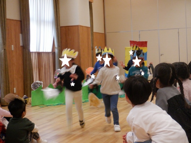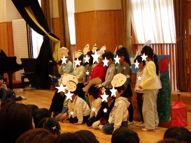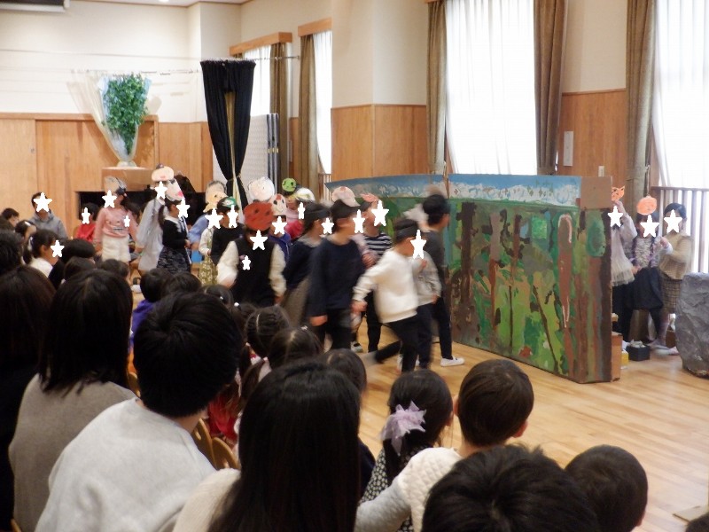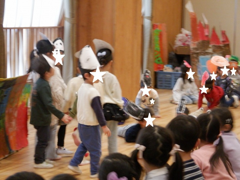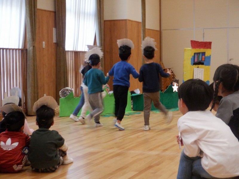 年長の劇・年中の劇ごっこは、どのクラスも自分たちでアイディアを出し合いながらお話を作っていったものです。いろいろな役になりきって楽しんでいましたよ
