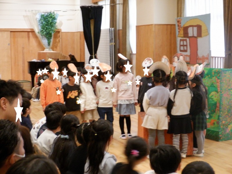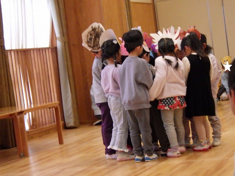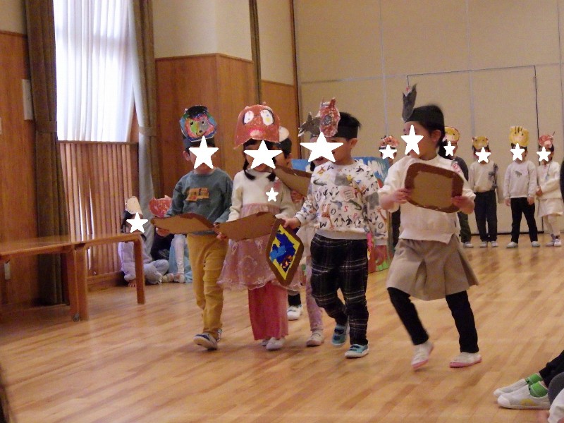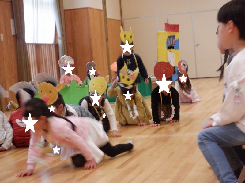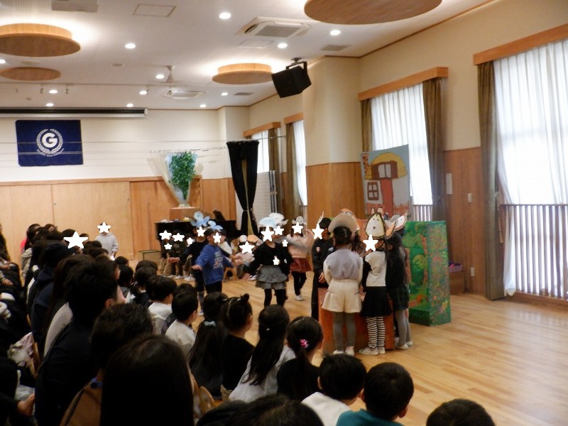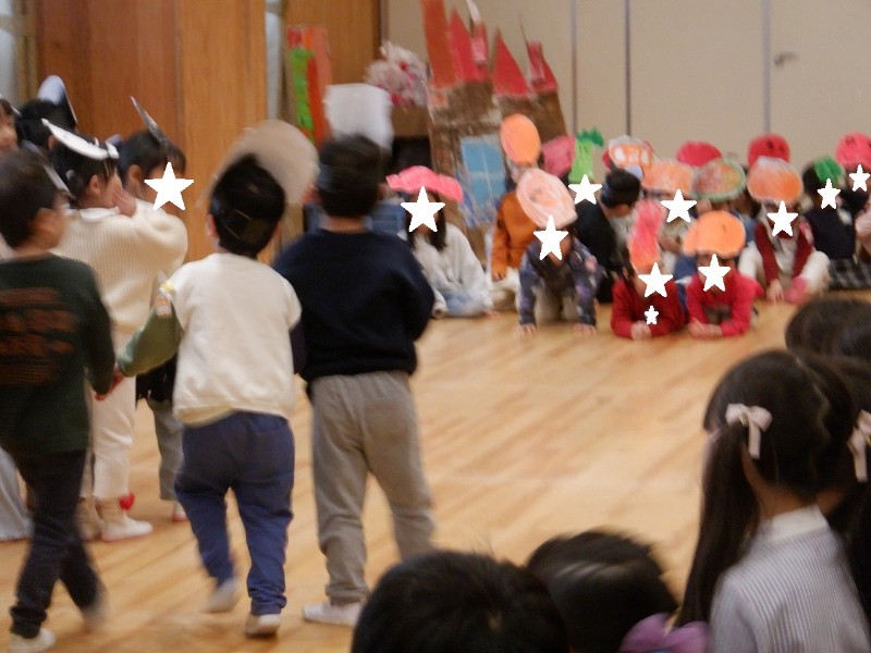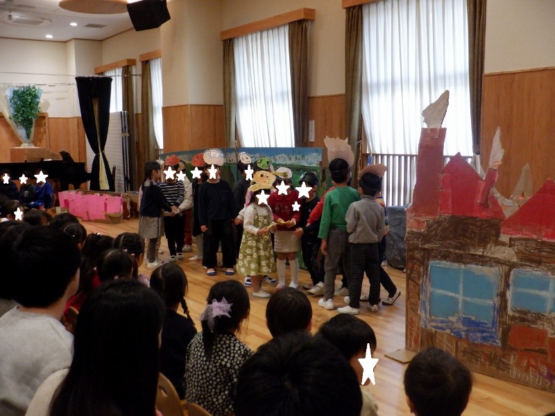 年長の劇・年中の劇ごっこは、どのクラスも自分たちでアイディアを出し合いながらお話を作っていったものです。いろいろな役になりきって楽しんでいましたよ