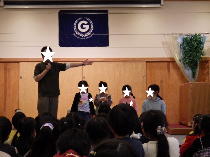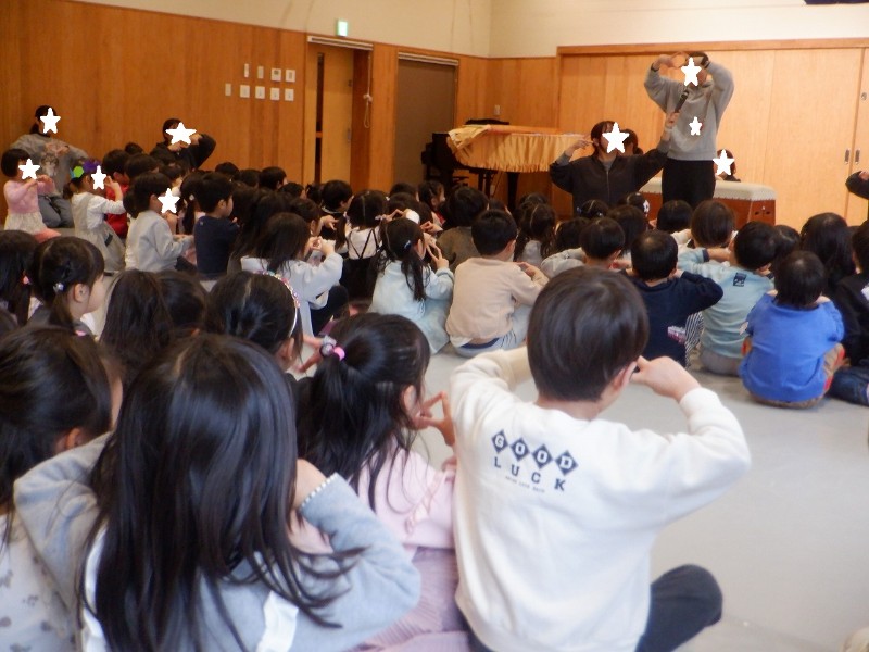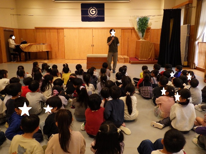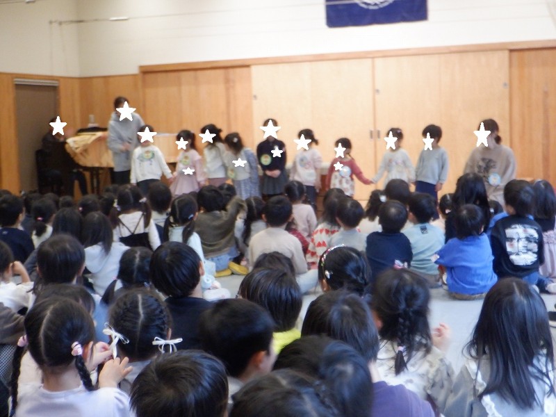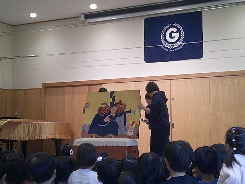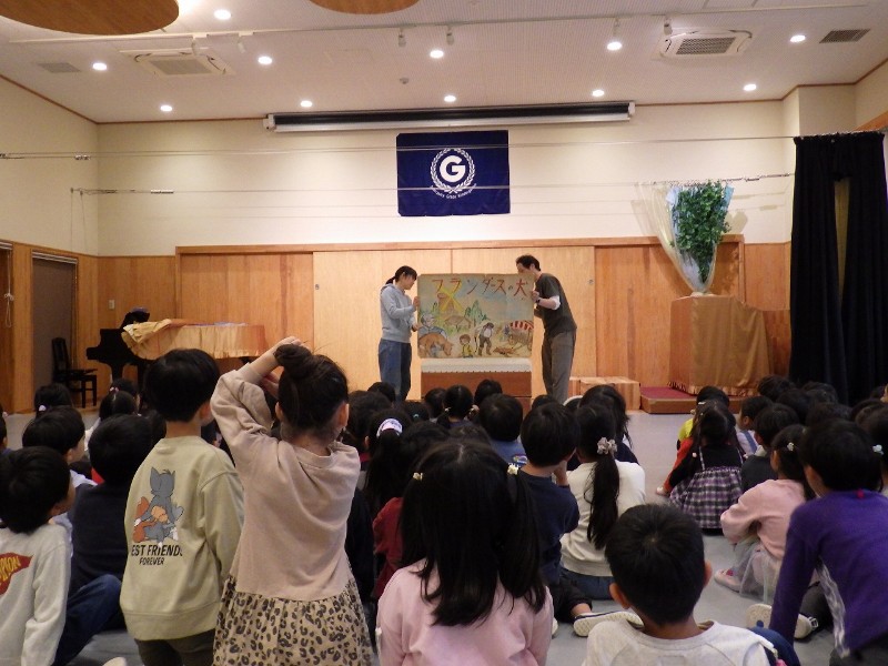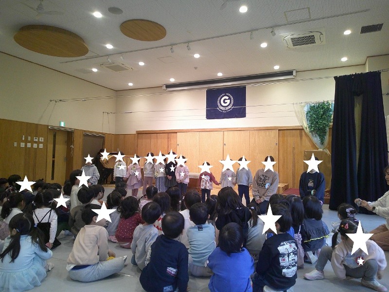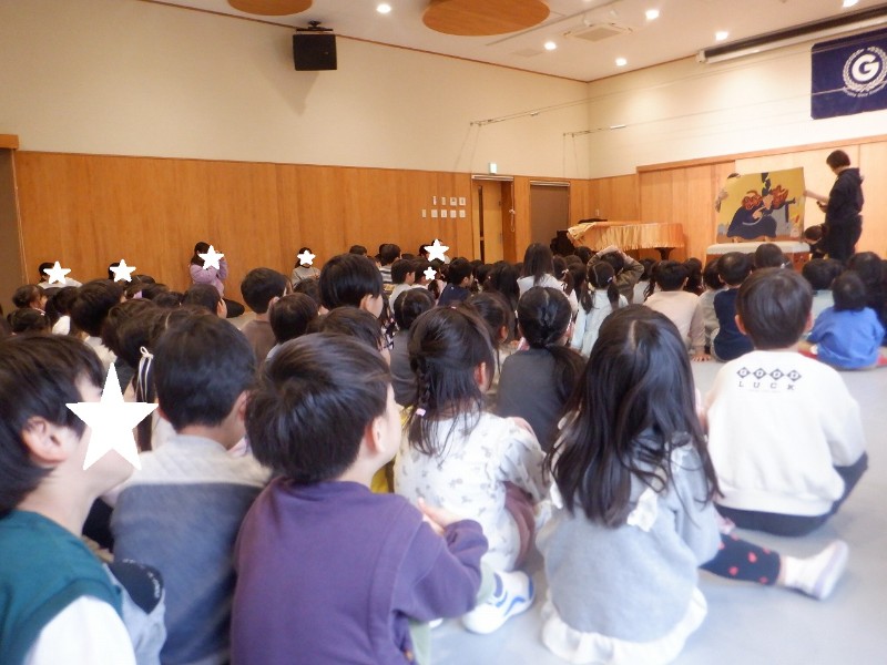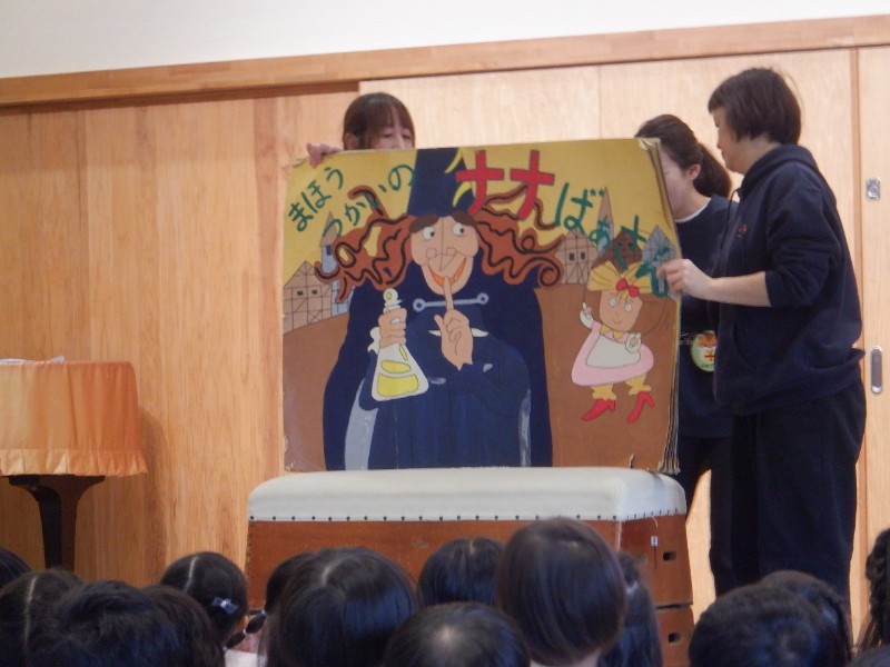 先生たちからのプレゼントは、年少・年中組は大型紙芝居「まほうつかいのナナばあさん」、年長組は大型紙芝居「フランダースの犬」でした。