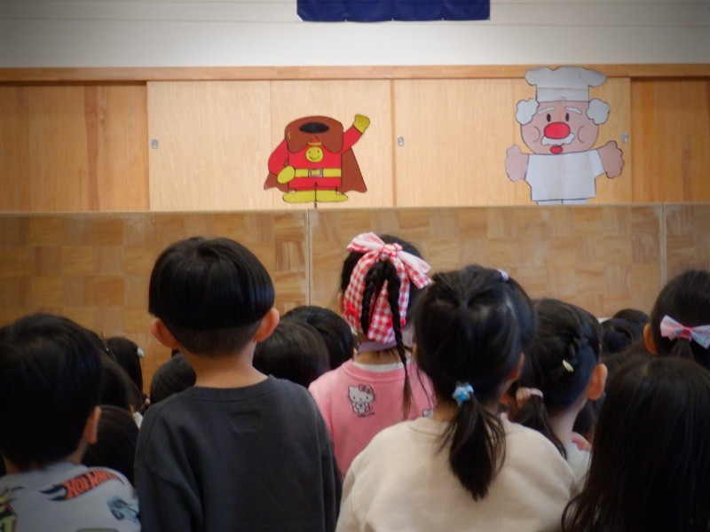 先生たちからのプレゼントは、ペープサート「それいけ!アンパンマン」でした。みんなのヒーロー☆アンパンマンが今回も大活躍のお話♪