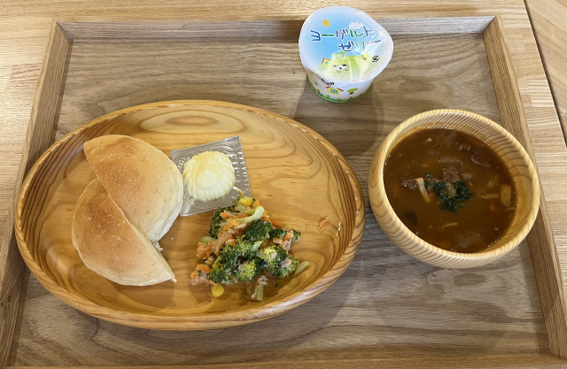 全粒入り白パン ビーフシチュー 型抜きチーズ ブロッコリーのサラダ ヨーグルトゼリー
