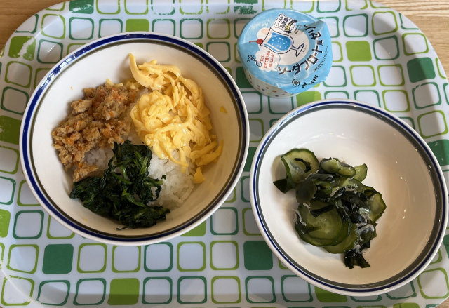 三色丼:いろどりがきれいで、野菜もたんぱく質もしっかり取れておいしかったです。優しい味付けで食べやすかったです。